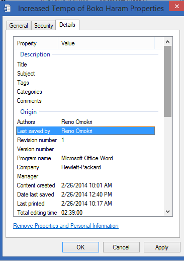 A regular Twitter user, Feyi Fawehinmi (@DoupleEph) had asked Journalist and Blogger, Abang Mercy (@AbangMercy) to forward him an email making the rounds and received by the latter linking the worrying spate of killings in which more than 200 persons had lost their lives (including 43 college kids) in Nigeria’s turbulent North East region in the space of four days, to the suspended Sanusi Lamido who has since dragged President Jonathan to court for legal breaches in ousting him. The revelations that followed from Fawehinmi’s Twitter Timeline would have the online community buzzing for a while. The emails, written by a certain Wendell Simlin have since been traced to Mr Omokri who handles the President’s social media brief . Mr Omokri’s name turned up after the mails were subjected to a property and digital footprint analyses. As the backlash from furious Twitter users aimed at Mr Omokri’s Twitter handle intensified, Mr Wendell Simlin’s Facebook page got yankedoff cyberspace. The microsoft document from where the inciting email was attached bore Mr Reno Omokri’s name. Wendell Simlin has since been discovered to be Reno Omokri and Reno Omokri, we have since found, shares the same flesh and soul with Mr Wendell Simlin.